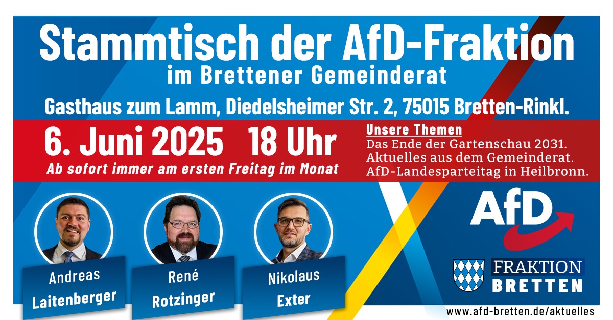 Die AfD Fraktion im Brettener Gemeinderat lädt am 6. Juni um 18:00 Uhr zum Stammtisch ein.